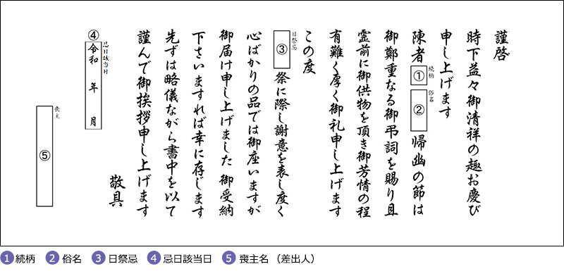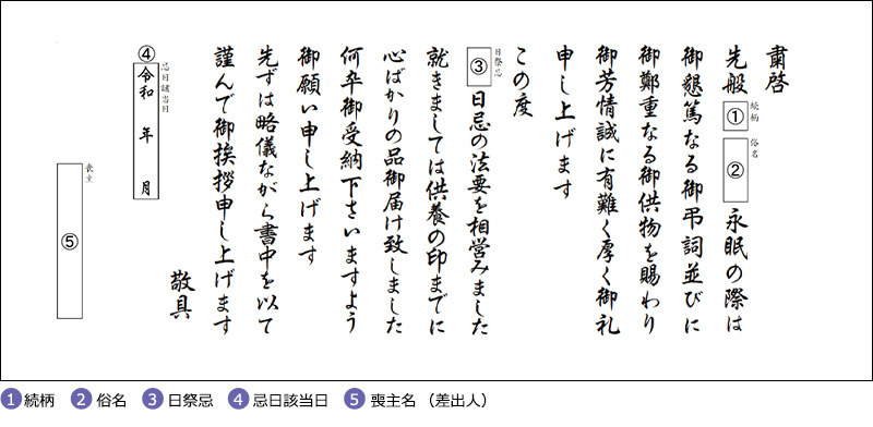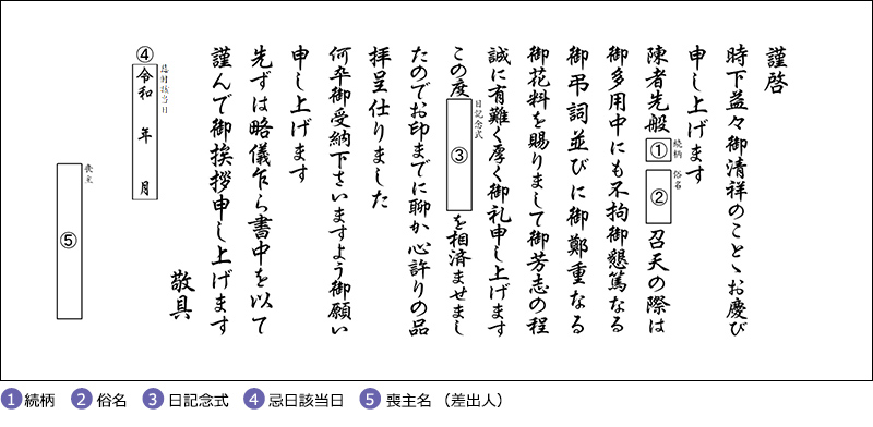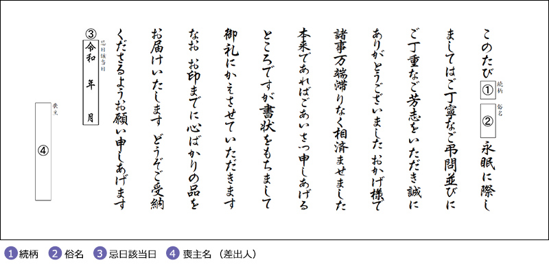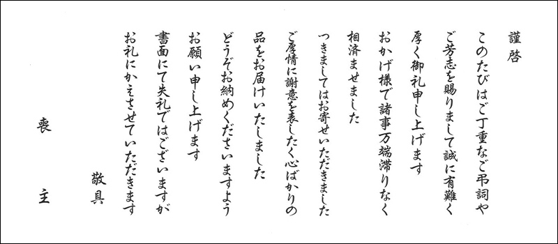 ご注文時、「挨拶状選択」画面にてお選びください。ご注文のお品全てに無料でお付けいたします。 オーダー挨拶状のように喪主名(差出人)等はお入れできません。 定型挨拶状も奉書封筒にお入れいたしますが、奉書封筒に喪主名(差出人)等はお入れできません。