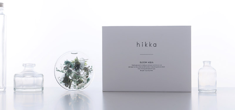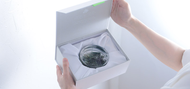 白を基調にしたシンプルなhikkaのギフトボックスに入れてお届けします。ちょっと大きめで重厚感ある箱は、大切にお届けするためのもの。開けた瞬間の、まるで宝石のような佇まいには思わず息をのむほどです。透明度の高いハーバリウムは、花や葉の優しい色彩を引き立て、その美しさに心弾むことでしょう。