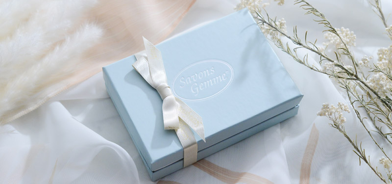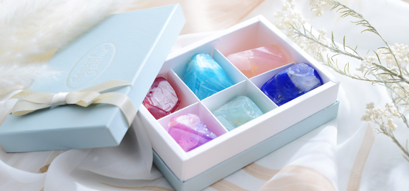 淡いブルーにリボンをかけた箱は、まるで高級チョコレートのようなビジュアル。蓋を開ければ宝石のような石鹸が良い香りと共にお目見えします。毎月のお誕生日ギフトでお馴染みの「宝石石鹸」を、ミニサイズで6種類セットにしてお届け。