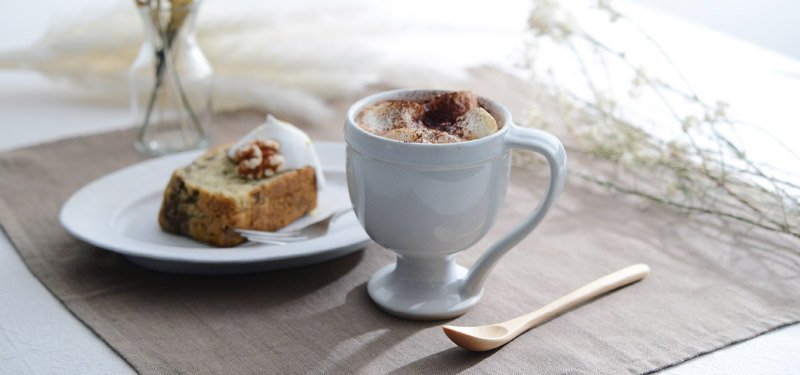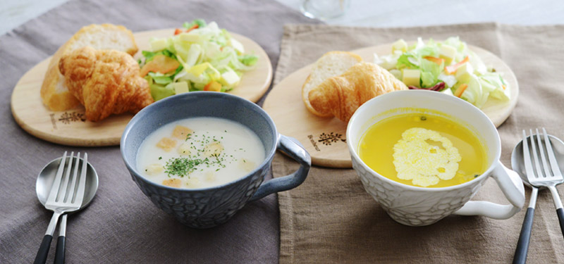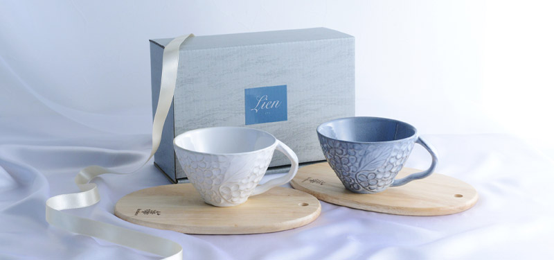 “おうちカフェ”…花と葉っぱのデザインや色合いがシックで魅力的なマグカップに、柔らかい風合いの木製プレートのセット。このセットなら、まるでカフェのようなテーブルセッティングが楽しめます。ペアセットだから、来客時にも見映え良く、お茶とお菓子を揃えてお出しできますね。