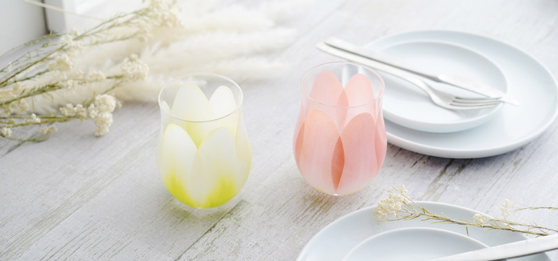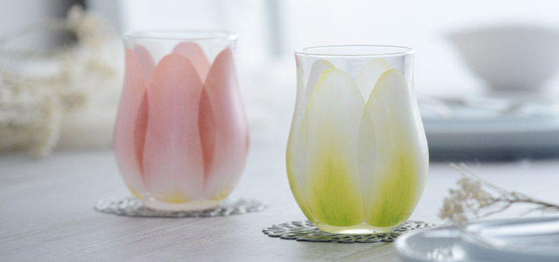 花びらが1枚1枚重なり合う様子を描いたチューリップのグラス。お花の形そのままに、グラス全体にデザインされているので、そこだけ春が訪れたかのように、食卓に花を咲かせてくれます。お家時間をよりハッピーに過ごしたい人に贈りたい一品です。