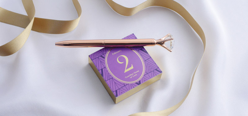 ヘッドにダイヤモチーフが付いたボールペン。シンプルなデザインと目を惹くダイヤモチーフで、手元を美しく魅せてくれます。定番の文房具も、こんな遊び心のあるデザインだとメモやお手紙など、一筆書く際にいつもより気持ちも高ぶりますね。