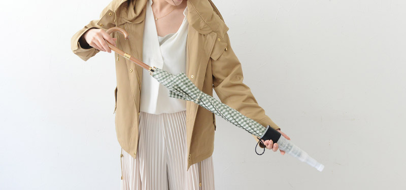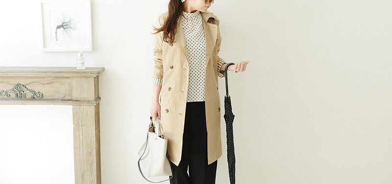 袖裏にストライプの生地を合わせているから、カジュアルにもエレガントにも着こなせるデザインです。また、レインコートに見えづらい生地とトレンチタイプのデザインのため、雨がやんでも違和感なく着られます。