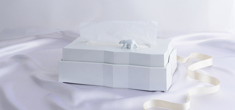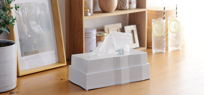 ティッシュを使うと氷山が溶けて小さくなるティッシュペーパーホルダー。上にはシロクマが一頭のっている、ちょっと涼しげでユニークなデザインで、お部屋のちょっとしたアクセントにも。