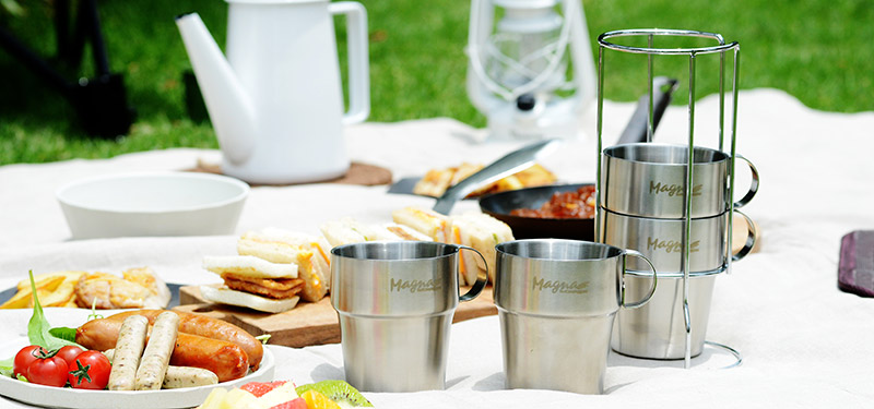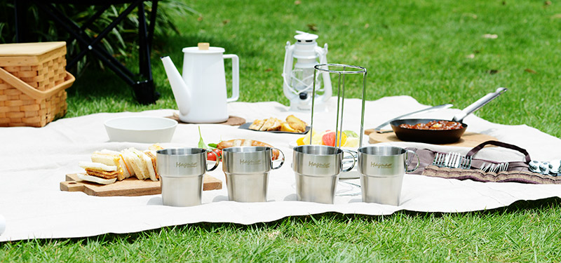 こちらはステンレス製で口あたりが良く、保冷保温性に優れたダブルウォール仕様のマグカップ。スタッキングでき、収納袋もついているから持ち運びもらくらく。