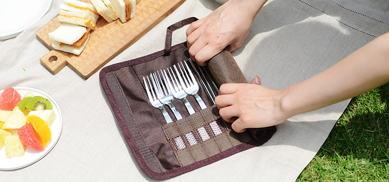 くるくる丸めてコンパクトになる収納ケースに入ったステンレス製カトラリーセット。スプーン・フォーク・お箸4組と、1本のナイフがセットになっているから、家族や友人たちとのキャンプ・バーベキューに持っていくのにぴったり。