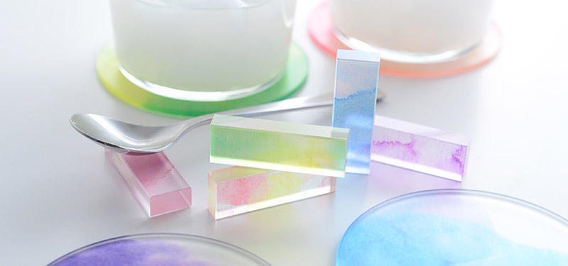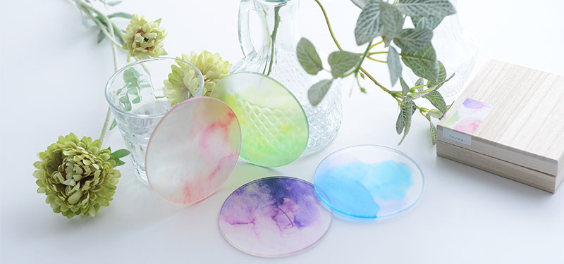 マットなアクリルに、水彩タッチ特有の霞みやぼやけ、色の重なりなどがそのまま表現された、鮮やかなコースター。吸い込まれそうな神秘的な色合いは、うっとりするほどの美しさです。