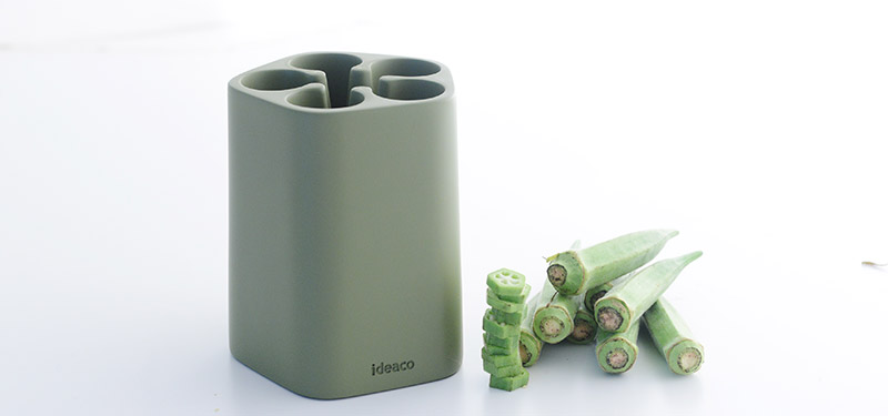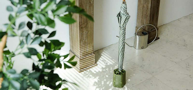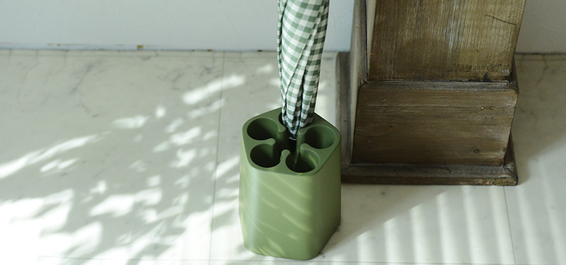 マットなグリーンと、馴染みのある断面。まさに、あのオクラを輪切りにしたようなデザインの傘立てです。ズッシリとして安定感があり、1つで5本の長傘を立てられる収納力がありながら、普段は靴箱などにしまっておけるほどのコンパクトなサイズ感も魅力。