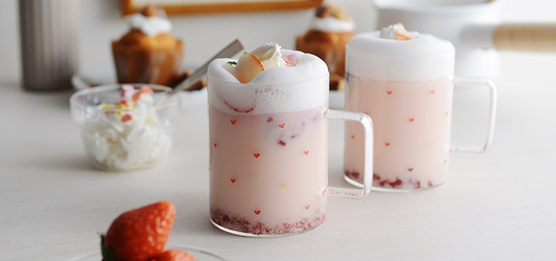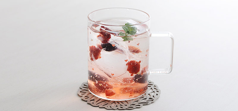 透明のガラスに小さなハートがちらほら。ひとつひとつ表情の異なるハート形のスタンプがあしらわれているデザインで、ティータイムの気分も盛り上がりそう。