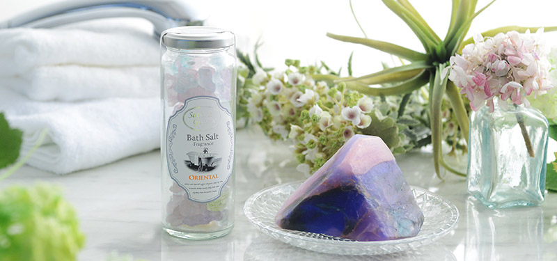 色とりどりの宝石の欠片を集めて、ガラスの瓶に詰めたようなバスソルトと、神秘的な色彩が魅力の宝石「オパール」をかたどった石鹸の組み合わせは、とても華やかでギフト映え十分です。