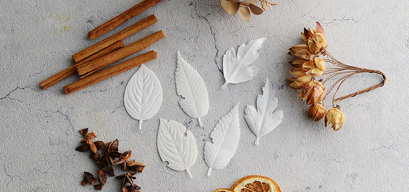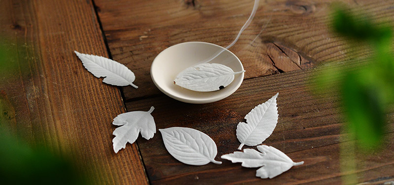 白や薄い黄色、橙色でほのかに色づいた6枚の葉っぱは、そのまま飾っておくと自然の葉を持ち帰って飾っているかのように、細やかな形や葉脈まで再現されています。置いて香り、焚いて広がる、新しい紙のお香です。