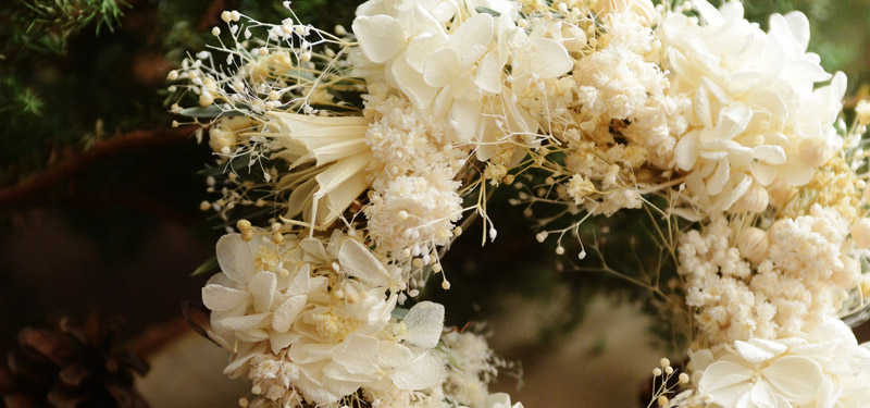 「hikka」というお花のブランドからお届けするリース。真っ白なお花たちがぎっしり並んだ目にも華やかな逸品で、輪の形はお家を守るという言い伝えがあるそう。ドライ&プリザーブドフラワーを使っているから、本物ならではのお花の美しさで、玄関やお部屋を華やかに彩ります。