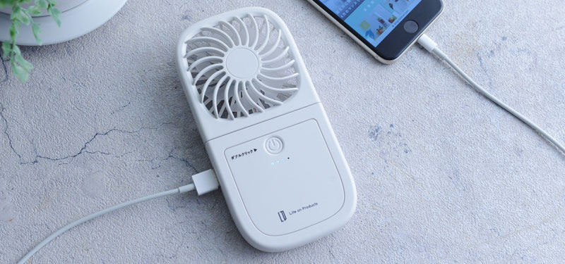 手のひらサイズの薄型ファンは、ストラップ付で角度も調整可能。両手がいっぱいのときも、首に下げて心地よい風を感じることができます。モバイルバッテリー機能搭載で、お出かけ中のバッテリー切れにも対応。折り曲げてデスクに置くこともできるので、空調が効きにくい場所でのデスクワークにも◎