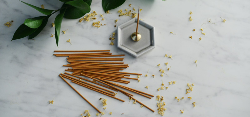 おうち時間を豊かにするために作られた香り成分を濃く配合した線香。香りのトレンド「金木犀(オスマンサス)」をベースにした甘く繊細な香りが広がります。モダンな印象の香立て付き。