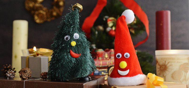 てのひらサイズのツリーとサンタハットのセット。電源を入れるとコミカルに歌いながら踊ります。コミカルな動きがとてもキュートです。