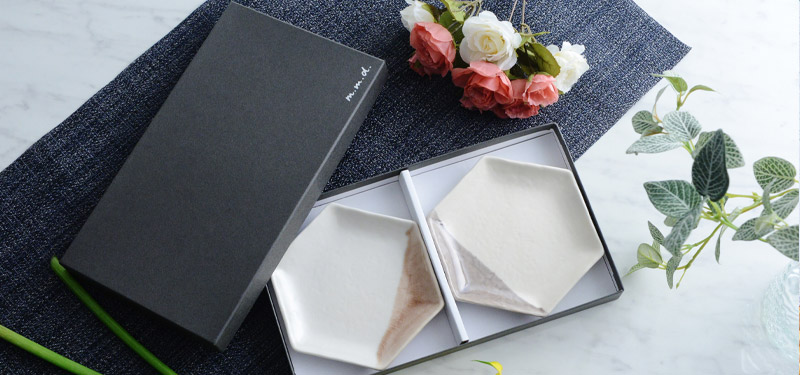 縁起の良いモチーフとして、古くから親しまれている六角形の取り皿。彩られたデザインも「末広がり」をイメージした二分掛けで、贈り物にぴったり。