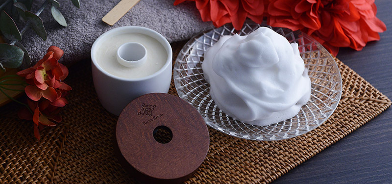 ドーナッツ型の白い陶器と、高級感のあるチーク材のスパチュラとフタがおしゃれな一品。その中に入っているのは、その名も『生せっけん』。「石鹸なのに固形ではない」「洗顔フォームではないのに柔らかい」不思議な石鹸です。