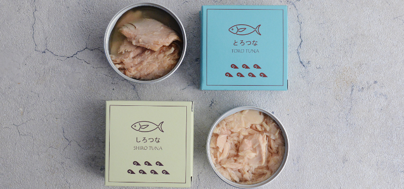 静岡の清水港で水揚げされたマグロを100%使ったとろつなとしろつな。2種類のツナ缶はそれぞれに味わいや口当たりが異なり、そのまま食べると、ぎゅっと詰まったまぐろの旨みと香りを感じられます。1匹のまぐろが描かれた、海を思わせるブルーのBOXもギフト感たっぷりです。