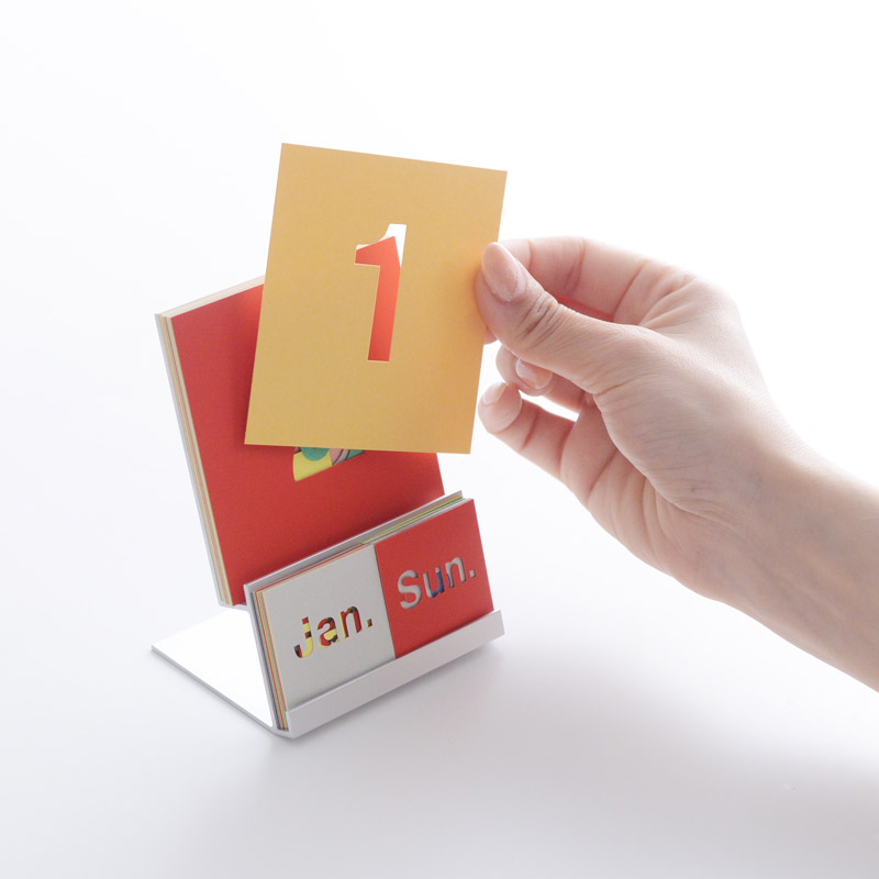 年が変わっても使い続けられる「万年カレンダー」。1枚ずつ異なる色のカードと、くり抜かれた文字の隙間から見える色の層が美しいデザインです。