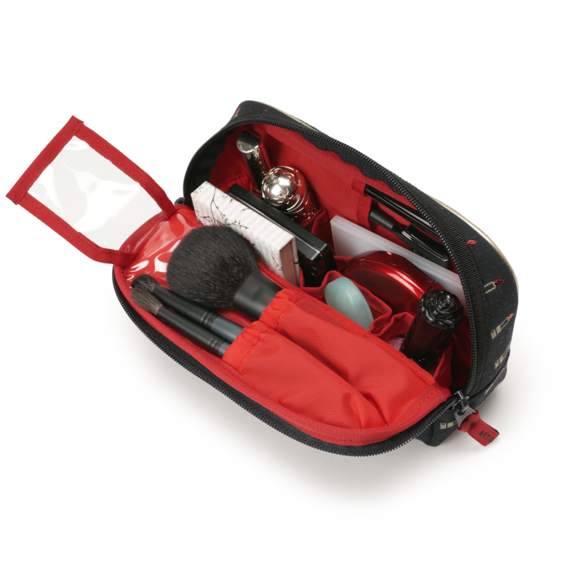 ブラックカラーの上に輝く、メタリックなラメ糸で織られた真紅のリップスティックとパイピングのゴールドカラーのアクセントが何とも言えない大人可愛いデザインです。フランスのジャカード織り専門メーカーDUTEL社ならではの、遊び心溢れたデザインで、より一層メイクアップに力がはいってしまうでしょう。トップからサイドにかけて、スロープが付いた形が特徴。ファスナーを全開にすると、フロント側のブラシホルダーが自然と手前に倒れて使いやすい仕様です。ポーチ内がひと目で見渡せ、奥に控えたブラシやリップ、パレット類などの取り出しもスムーズ。またファスナーを全開にしても、本体はしっかり自立したまま。メイク中に片手でポーチを抑えておく必要がなく、スマートにメイクがすすみます。