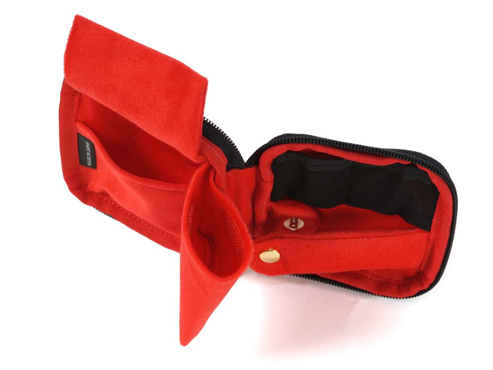 仕事のあとにデートやパーティが控えているとき、旅先にいくつか持って行きたいとき、大切なジュエリーを優しく守り、コンパクトに持ち運ぶことができます。ファスナーを開けると見開きになり、左面には上下のポケットに加え、フラップポケットが。小さなアイテムを収納しやすく、取り出しやすくなっています。右面にはスエード調のリングホルダーがあり、柔らかな金属のリングも傷つけません。