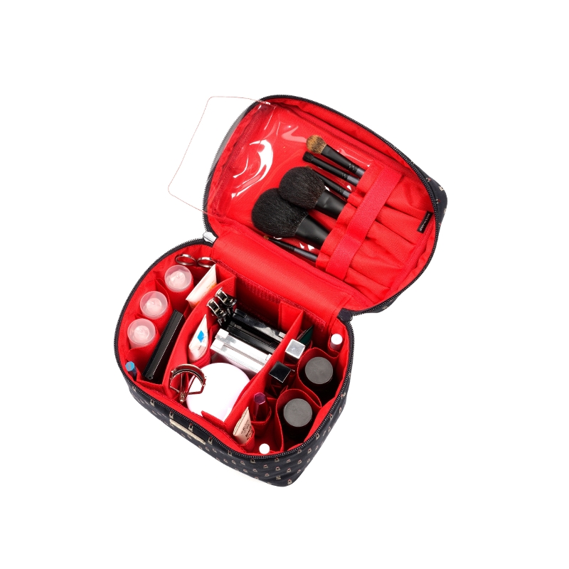 蓋の裏側には5つのブラシホルダーとブラシカバーが付いており、ブラシの毛先をしっかり保護し、粉飛びの心配もありません。充実した収納力が魅力の本体には、両サイドに4つのペンホルダーと5つのボトルホルダーを配置。取り外しが可能な2枚の仕切りには、ボトルホルダー/ゴムバンド、リップホルダー/透明ポケットの異なるタイプの収納スペースが付いています。