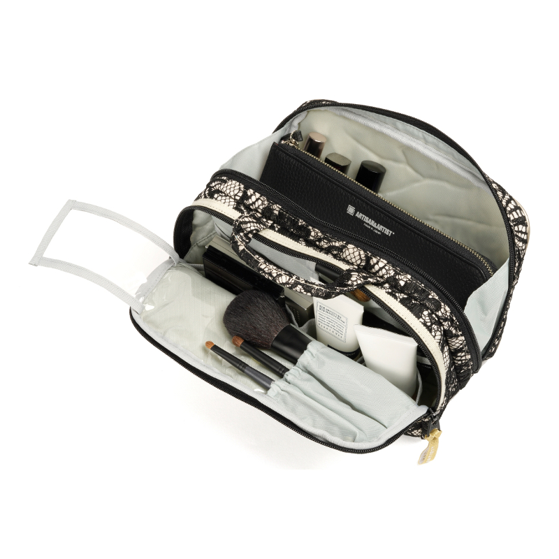 トップからサイドにかけてスロープが付いた形が特徴で、ボックス型よりもコンパクトながら十分な容量を備えたポーチ。斜めに開くつくりで、ファスナーを全開にしてもしっかりと自立します。広い底マチ付きで使い勝手の良い奥のスペースには、フェースパウダーやミニボトルもそのままIN。旅行時にも重宝します。通帳やパスポート、長財布も入るサイズなので、ミニバッグやバッグ・イン・バッグとしても使えます。