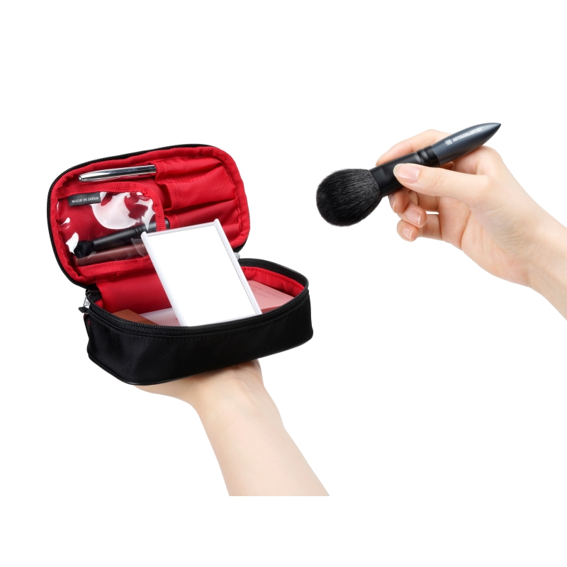 ハンドルに指を通して手のひらにポーチを乗せると、ハンディ・メイクドレッサーに早変わり。ファスナーは3面しっかり開くので中の物の出し入れがしやすく、仕切りのないメインスペースには、自由な収納ができます。女性の手に収まるサイズなのでポーチを置く必要がなく、ぐらつくことなくいつでもどこでも素早くコスメが取り出せて、化粧直しができます。ブラシホルダーは4つ、アイブローやペンシル、マスカラなどを収納可能です。