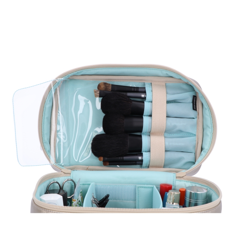 収納力が充実した、少し背が高めのメイクバニティケース。蓋の裏側には5つのブラシホルダーとブラシカバーが付いており、ブラシの毛先をしっかり保護し、粉飛びの心配もありません。充実した収納力が魅力の本体には、両サイドに4つのペンホルダーと5つのボトルホルダーを配置。取り外しが可能な2枚の仕切りには、ボトルホルダー/ゴムバンド、リップホルダー/透明ポケットの異なるタイプの収納スペースが付いています。