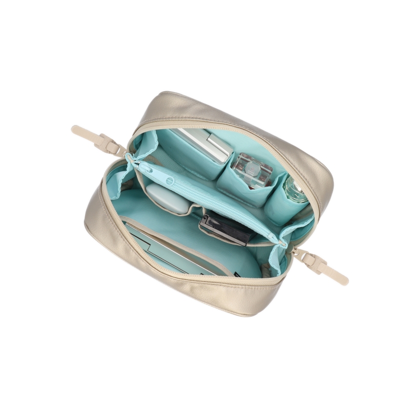 大容量のボックス型のポーチ。笹マチが付いており、沢山のアイテムを入れても、開けた際に横からアイテムが落ちてしまうことを防いでくれます。インナーの両サイドにはスタンド式ホルダーが3つ。一方は全面サイズ、もう一方は3分割サイズと多様な形状のアイテムの収納に対応しています。中央の仕切りはファスナー付きのポケットになっており、細かなアイテムを収納することが出来ます。さらにこの仕切りの片面には、2分割サイズのスタンド式ホルダーも付いています。メイク道具に限らず、カード類など、迷子になりがちな日用品をきちんと整理してくれます。