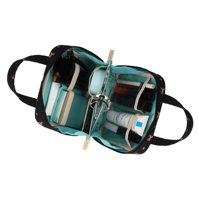 特筆すべきは、この形状による使用感。メイクブラシやファンデーションなどを立てて収納するスタイルにすることで、薄さをキープ。取り出しの際も、ファスナーを全開にする必要がありません。自立型なのでメイク中にポーチが倒れてしまう心配もなし。スペースがないときは、持ち手を指にかけてメイクも可能です。