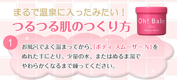 温泉にも含まれている成分でできた3種のスクラブとマッサージにより、古く固くなった角質を優しく取り除きます。また、由布院温泉の天然温泉水(角質柔軟成分)やシルクパウダー(保湿成分)を配合。肌を整え、つるつるすべすべのボディに磨き上げます。 ※硫化ナトリウム・炭酸水素ナトリウム・炭酸ナトリウム