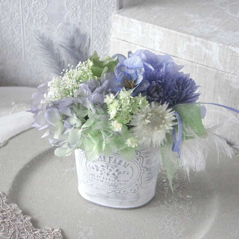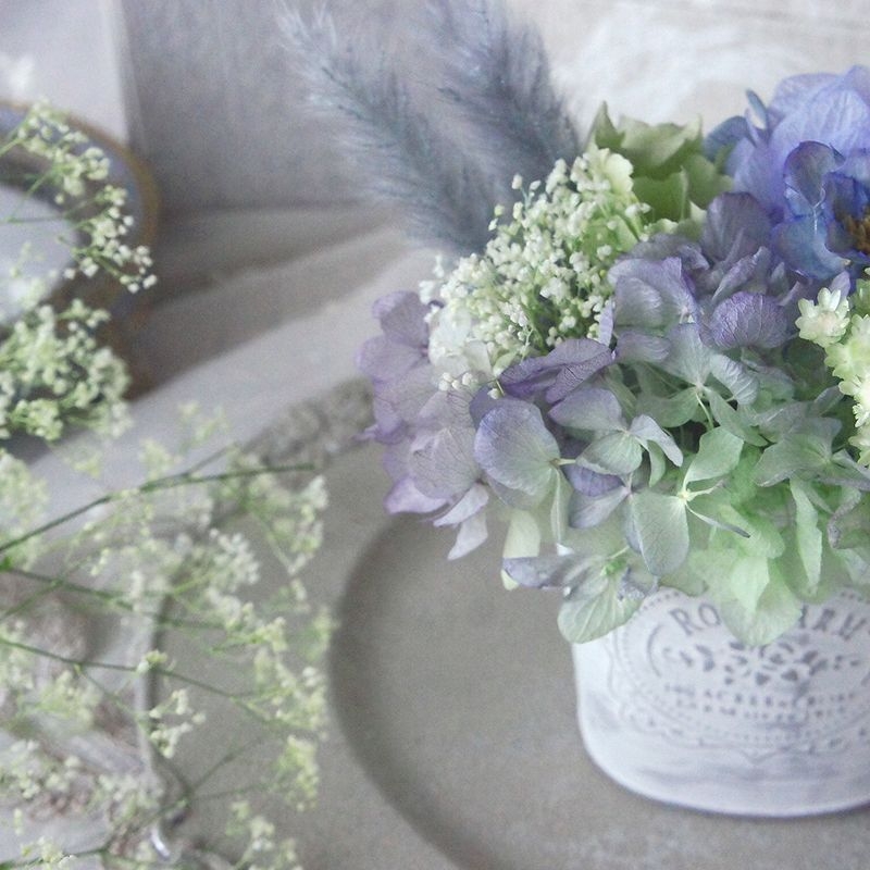 ライトパープル、ブルーベリーカラー、ライムグリーンで作った、涼し気で軽やかな雰囲気のプリザーブドフラワーのアレンジです。