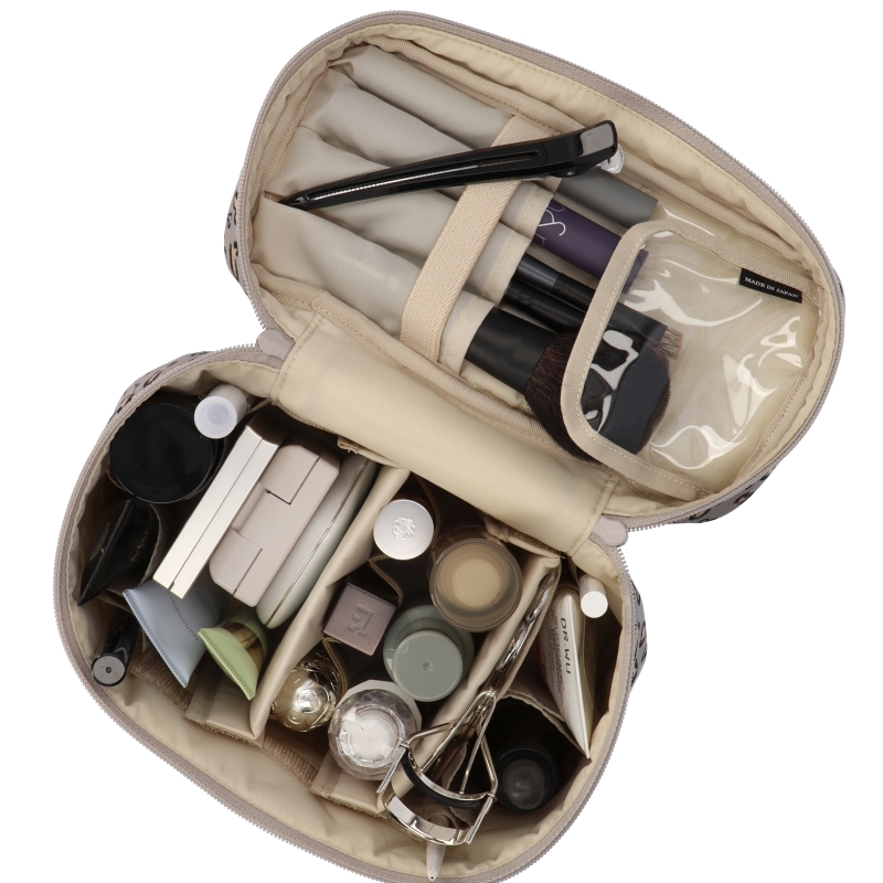 約12cmの高さのアイテムを、立てた状態で収納ができる小さめバニティ。内装の両サイドには大小のループポケットを各4つ合計8つ取り付けてあるので、散らかりやすいバニティの中身をきれいに収める役割を果たしてくれます。フタの内側には4つのブラシホルダー。ブラシだけでなく、マスカラなどスティック型のアイテムを収納可能。ビニール製のカバーがブラシの毛先もきちんと保護し、ポーチ内のへの粉飛び防止の役割も担います。