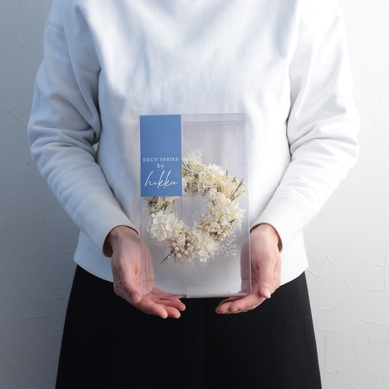 素敵なお宅は、お部屋の中だけじゃなくお家の外にまでお手入れや配慮が行き届いているもの。特に綺麗にデコレーションしてある玄関先を見ると、つい憧れてしまうことってありませんか。 こちらは「hikka」というお花のブランドからお届けするリース。真っ白なお花たちがぎっしり並んだ目にも華やかな逸品です。 季節やお家のテイストを問わず飾れるデザインで、お家の顔「玄関」が簡単にグレードアップ。大きすぎない控えめなサイズ感だから、お部屋のドアにも自然にマッチします。 いつもお世話になっている方への御礼や、お引っ越し祝いにも◎なカジュアルリースは、お花を贈る代わりに選ぶギフトとしておすすめです。