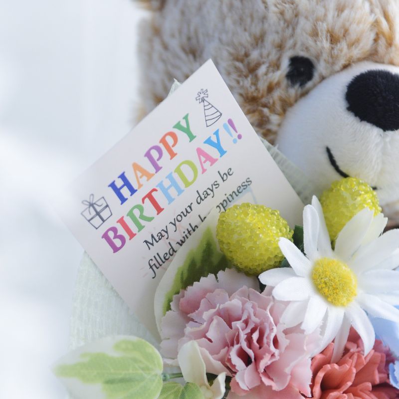 毎年やってくる誕生日は、何を贈るか考えるのが楽しくもあり悩ましいもの。とくに節目のバースデーには特別なものを贈りたいですよね。 こちらは、フラワーアレンジメントの講師も務めるお花のプロフェッショナルが、花材をひとつひとつ選び手作りした花束を、可愛いくまのぬいぐるみが抱えたギフト。お祝いのメッセージの入ったピック付きで、誕生日専用の贈り物としてお届けします。