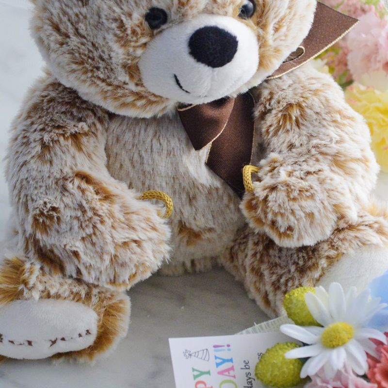 ふわふわの毛並みとやわらかな手触りのテディベアは、毛先と根元のカラーがブラウンからオフホワイトのグラデーションになったミルクティーカラー。まん丸の目もお鼻、にっこり笑った表情がかわいい癒し系のくまさんです。