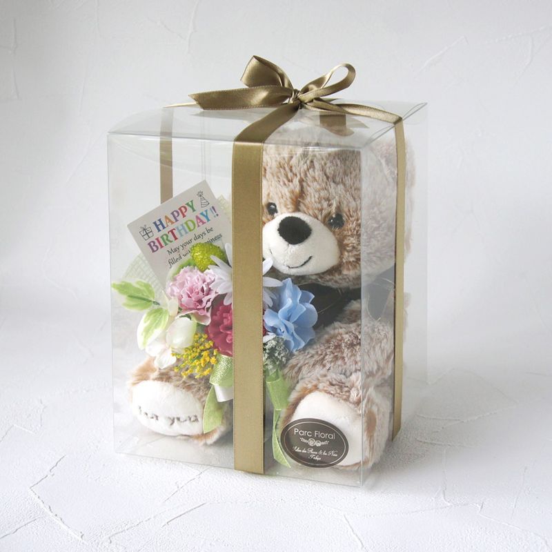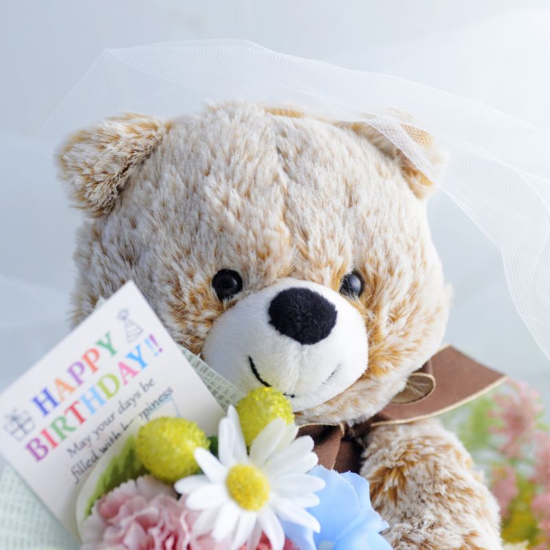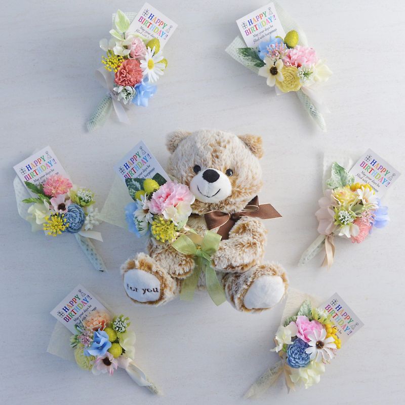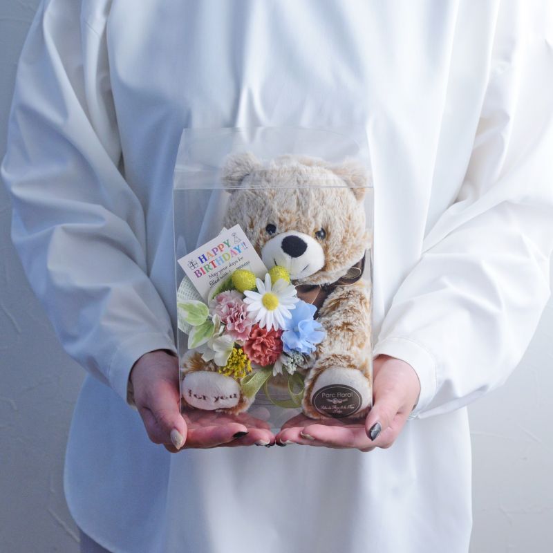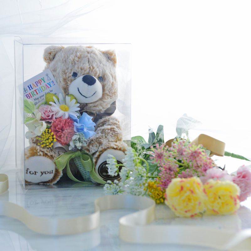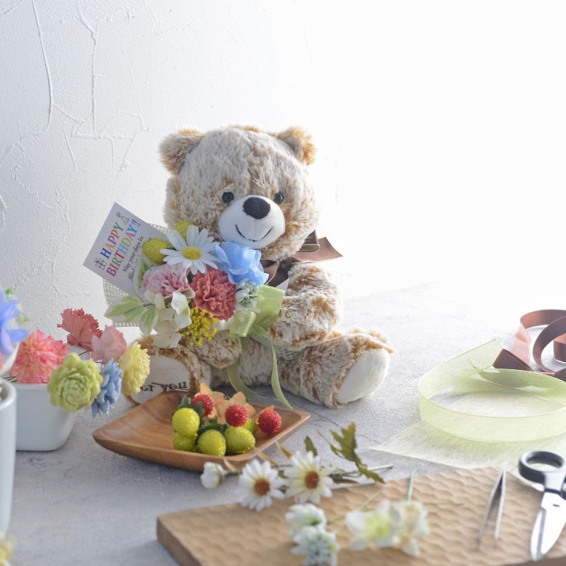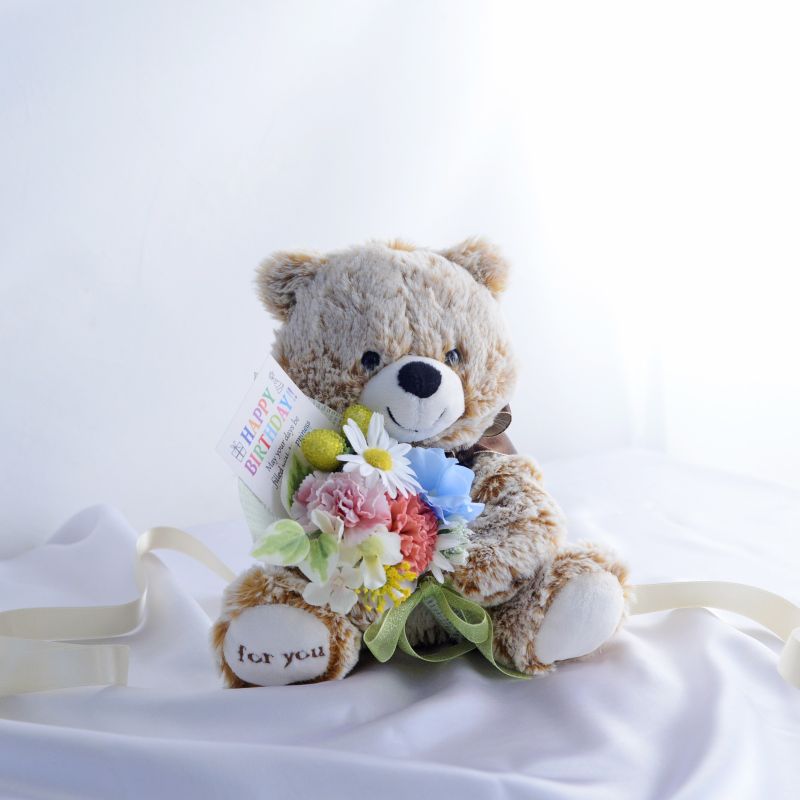 愛くるしい表情のテディベアが抱えているのは、プロのフラワーコーディネーターがひとつずつ手作りした花束。アーティフィシャルフラワーを使い、1年に一度の誕生日を祝うのにふさわしく、明るくカラフルに仕上げました。