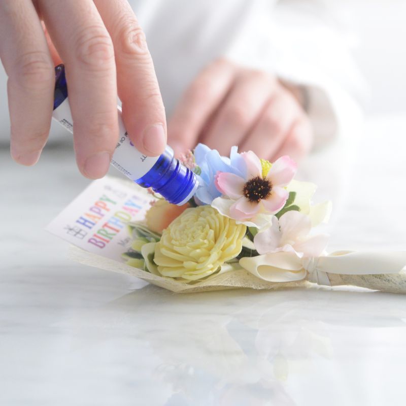 1本は「ソラフラワー」という、植物の殻を花びらに見立ててつくられたお花を入れていて、アロマオイルを垂らせば香りが広がる素材。お好みの香りをつけて飾ることもできますよ。