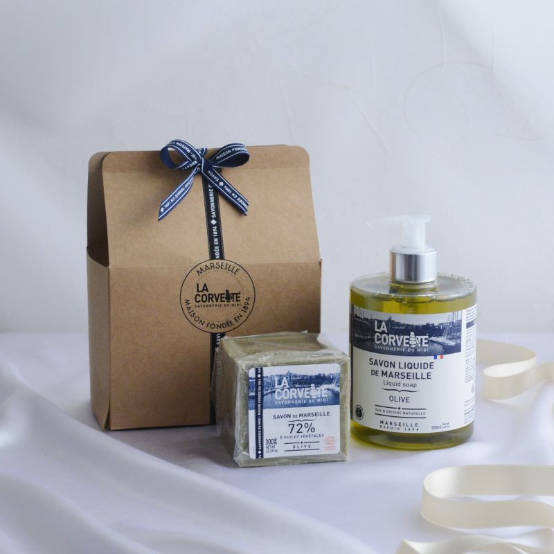 南フランスの老舗ブランドLA CORVETTER(R)(ラ・コルベット)が贈る、オリーブの恵みを詰め込んだギフトバッグ。伝統製法で作られたマルセイユ石鹸と、全身に使えるリキッドソープをセットにしました。 植物由来オイルのやさしい洗い心地と、ナチュラルで上質な佇まいは、毎日のケアにも大切な方への贈り物にも最適です。