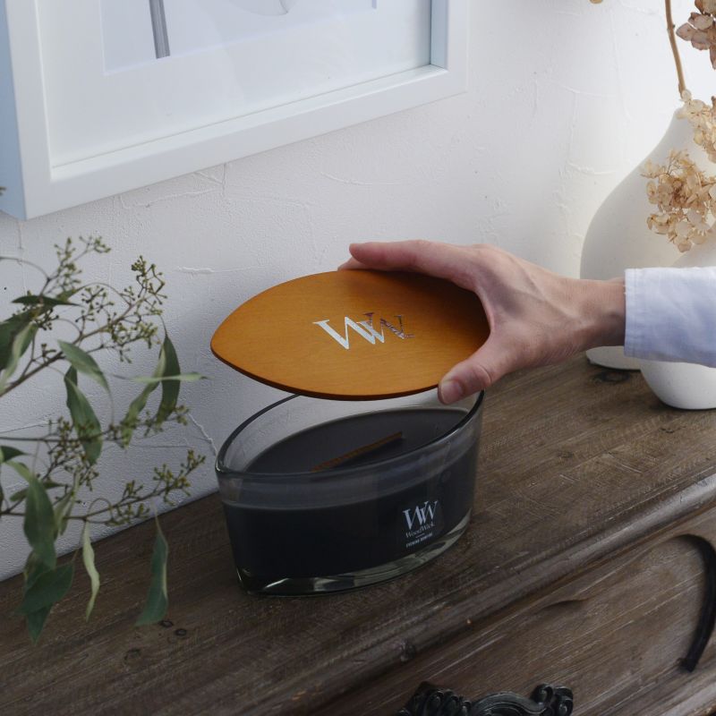 「木(ウッド)でできた芯(ウィック)」は、ブランド名の由来にもなっている「WoodWick(ウッドウィック)」がこだわる最大の特徴。木製芯を横に広げていることで、炎が大きく横に広がり、暖炉で揺らめく炎を演出しています。流れるように美しい炎を眺めているときの心地よさは、癒し効果抜群。この炎の揺らぎは、他のキャンドルでは味わえない唯一無二の魅力です。