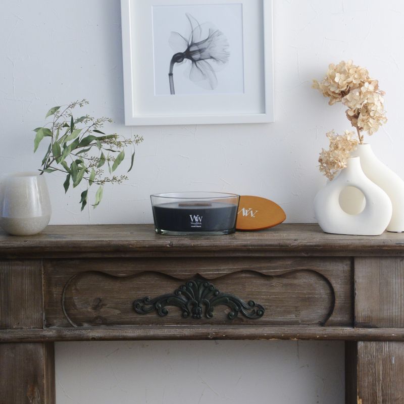 重厚感ある船形のガラス製のホルダーはインテリアのアクセントにも◎。火をともさずとも、キャンドルの周りには香りが漂います。 高級感ある木蓋でフタをすれば、香りの揮発やホコリが溜まるのを防ぐだけでなく、サイドボードや玄関に飾りたくなるほど、デザイン性の高いオブジェになりますよ。