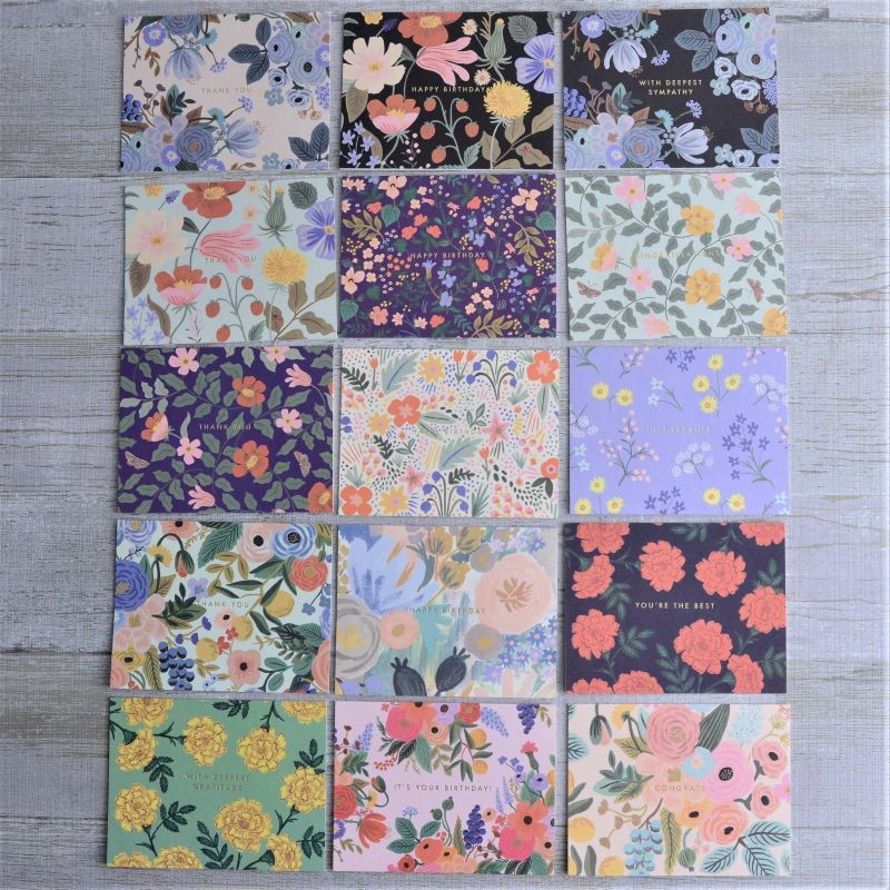 RIFLE PAPER CO.(ライフルペーパー)のデザインは、イラストレーターのアンナ・ボンドにより、水彩画とデザインを融合した独特な手法で描かれています。 1年の中でギフトを贈るシーンが多い、「THANK YOU」「HAPPY BIRTHDAY」など、お礼とお誕生日のカードはそれぞれ5枚ずつ。「CONGRATS」「YOU’RE THE BEST」「JUST BECAUSE」など、日々の贈り物に使えるタイトルは全5種類、各1枚ずつの合計15枚入り。そのデザインは全て異なり、シックなカラーの大人っぽいものから、1種類のお花のシンプルなものまで、贈る相手に合わせてあれこれ選ぶ楽しみも味わえますよ。