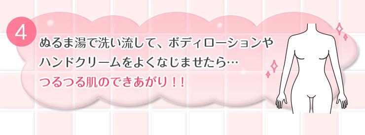 温泉にも含まれている成分でできた3種のスクラブとマッサージにより、古く固くなった角質を優しく取り除きます。また、由布院温泉の天然温泉水(角質柔軟成分)やシルクパウダー(保湿成分)を配合。肌を整え、つるつるすべすべのボディに磨き上げます。 ※硫化ナトリウム・炭酸水素ナトリウム・炭酸ナトリウム