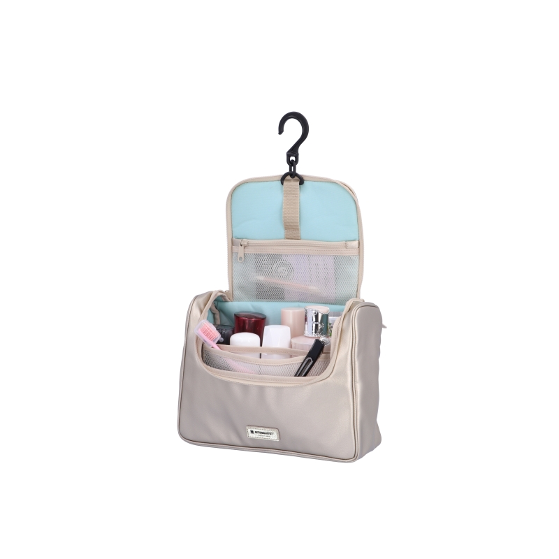 旅行の際に活躍する、フックが付いた大きいサイズのポーチ。内側背面、側面にはループポケットやシャーリングゴム付きポケットが付いており、自立しないチューブ類などを収納できます。メインスペースには仕切りが無いため、大きめのアイテムも収納が可能。内側前面のビニールポケットには、歯ブラシなどを収納した際でも、他のアイテムが濡れることを防ぎます。また、蓋の裏側には見失いがちな小さいアイテムを収納するのに便利なメッシュポケット付いています。さらに、フックが付いているので、タオルハンガーやシャワーカーテンレールなどに掛けて使用することができます。