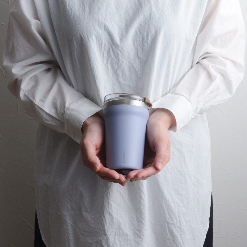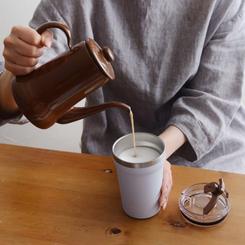 こちらのタンブラーは、温冷ともに保つことができる真空二層構造。ホットでもアイスでも、蓋つきのカップごと入れて使用する形状です。