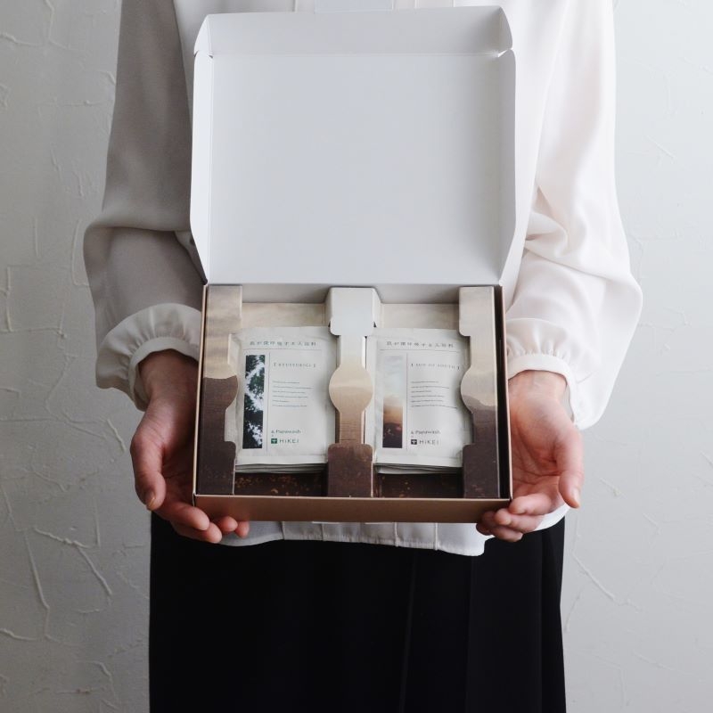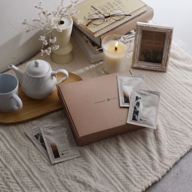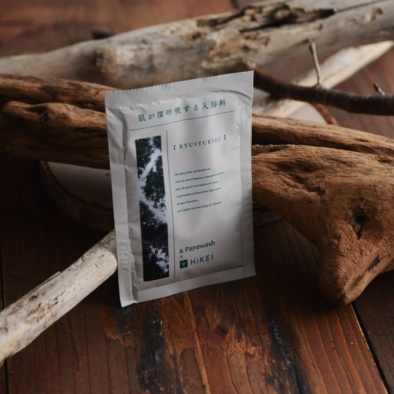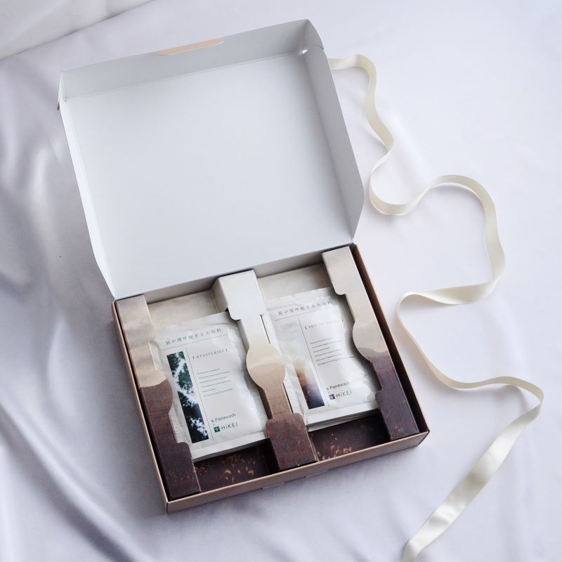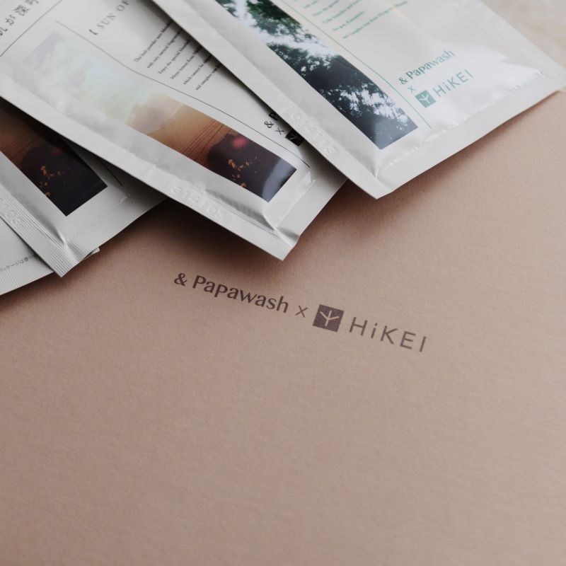 九州の森に広がる木々や、暖かな日の光りをイメージした香りの入浴料セット。長きにわたり定評のある酵素洗顔料のブランド「Papawash」と、自然由来の原料にこだわったフレグランス製品を手がけるブランド「HiKEI」が共同で作られたもので、旅雑誌や日記の1ページのようなパッケージも素敵です。