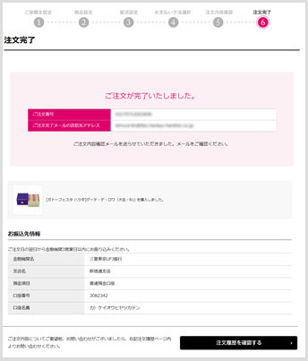 ご注文完了後、ご注文完了画面にて「ご注文番号」が表示され、 ご登録のメールアドレスに shop@keio-dept.co.jpより「ご注文確認のご連絡」が配信されます。
