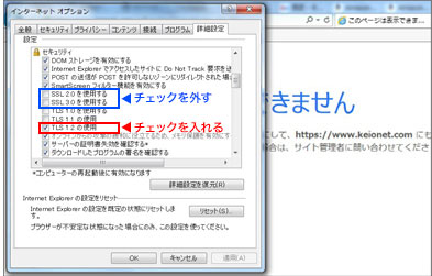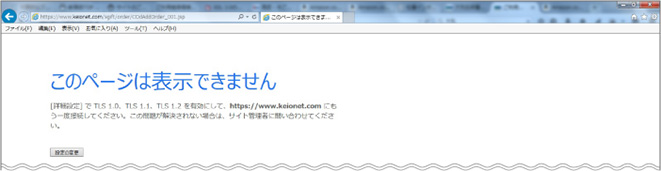 京王百貨店では、お客様の個人情報を入力いただくページについて通信の暗号化を行っております。暗号化通信の方法の1つである「SSL3.0」に脆弱性が存在するため、このたび「SSL3.0」の通信を無効化いたしました。そのため「SSL3.0」のみ有効に設定されているお客様は「このページは表示できません」等が表示されページを閲覧いただけません。