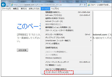 【1】Internet Explorerの「ツール」メニューの「インターネットオプション」をクリックします。